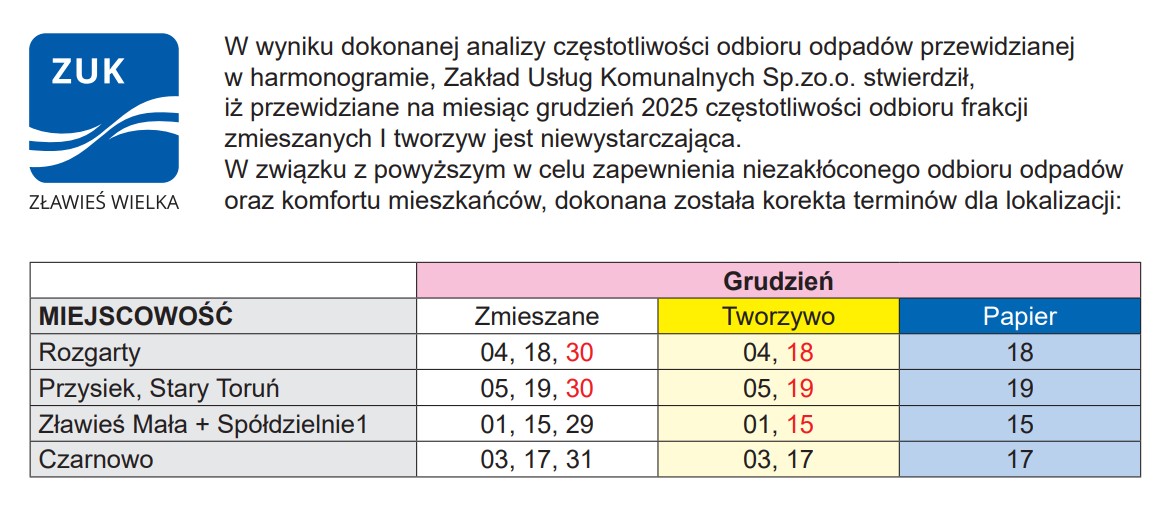 Dodatkowy odbiór odpadów komunalnych w grudniu 2025 dla miejscowości: Rozgarty, Przysiek, Stary Toruń, Zławieś Mała+Spółdzielnie, Czarnowo